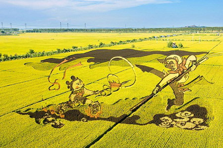 營造超大面積、高觀賞性的農業景觀。以稻田畫為例,在空曠遼闊的稻田里,通過種植不同品種,葉面有色差的水稻,通過預先的規劃,描線,種植,隨著水稻的生長,最終呈現規劃好的圖形。大尺度的畫面給游客強大的視覺沖擊力。