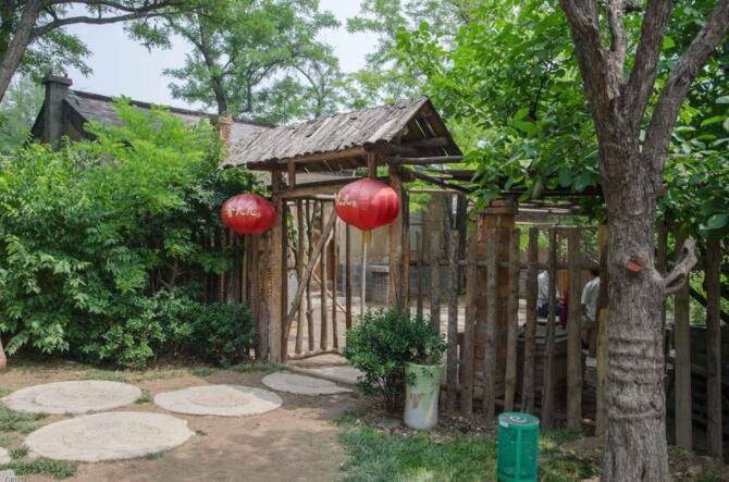 籬笆上爬滿豆角秧,豆角秧里還夾雜著喇叭花藤蘿,像密封的四堵墻 ,墻里是一棵又一棵的桃樹、杏樹、山楂樹、花紅果子樹,墻外是一些楊、柳、槐、榆、梨樹,就像是墻上的兩道鐵箍。古典、開朗兩相宜,尖塔形斜頂,抹灰木架與柱式裝飾,自然建筑材料與攀附其上的藤蔓相映成趣,經典而不落時尚。